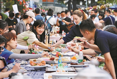 Citizens enjoy the long table banquet. [Photo by Tang Yan]